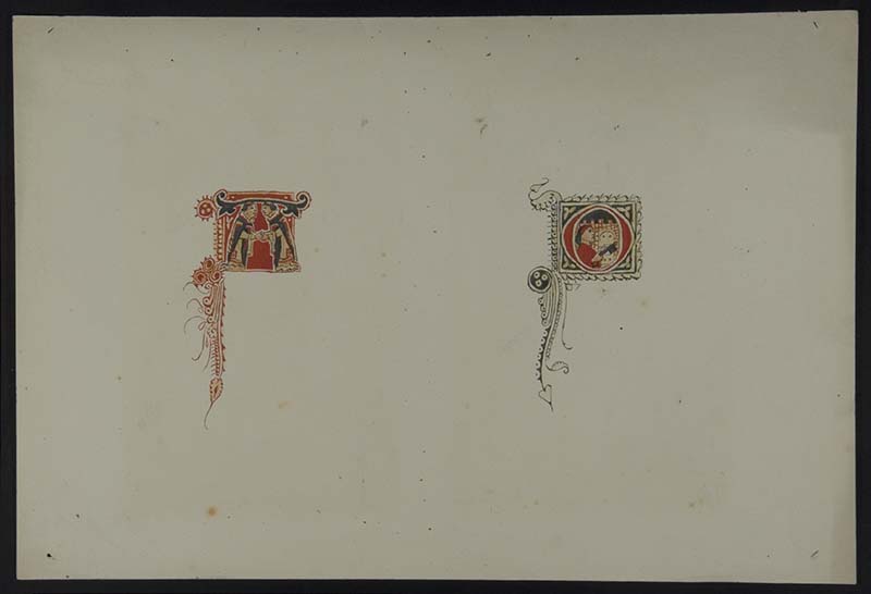 La tempera fa parte della serie di trentun disegni raffiguranti iniziali figurate, eseguiti da Giulio de Franceschi in vista della pubblicazione di Giuseppe Caprin "Il Trecento a Trieste", edita a Trieste dallo stesso autore nel 1897. La paternità dei disegni preparatori al de Franceschi è affermata da Caprin sul verso del frontespizio, e le iniziali sono copiate da quelle presenti nel codice membranaceo con gli Statuti di Trieste del 1350, conservato nell'Archivio Diplomatico di Trieste (inv. á EE 2). L'iniziale in esame è copiata da quella presente a c. 264 recto del codice e compare a p. 41 del volume di Caprin, come incipit del capitolo III, Entro le mura.
