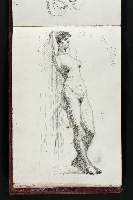 Sul recto sono abbozzate a matita di grafite delle caricature di teste maschili di profilo sinistro e destro, mentre sul verso c'è un nudo femminile in piedi di profilo destro: condotto a penna e inchiostro di china su una traccia di matita. La figura è delineata con un tratto nervoso della penna che si addensa in una sovrapposizione di segni paralleli, incrociati e ondulati per la resa dei rilievi plastico - chiaroscurali.