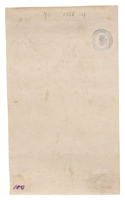 Figura femminile stante, con grandi ali: rivolge il capo verso sinistra, tiene il braccio sinistro piegato sul fianco e con il destro regge un lungo bastone. In basso a destra lo schizzo di una testa (?).