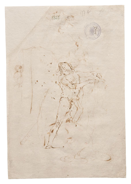 Un soldato con l'elmo sul capo e un vecchio che poggia il braccio sinistro su una stele rivolgono lo sguardo verso un uomo seduto a terra, visto di schiena. Sul verso, schizzo con figura di ignudo.