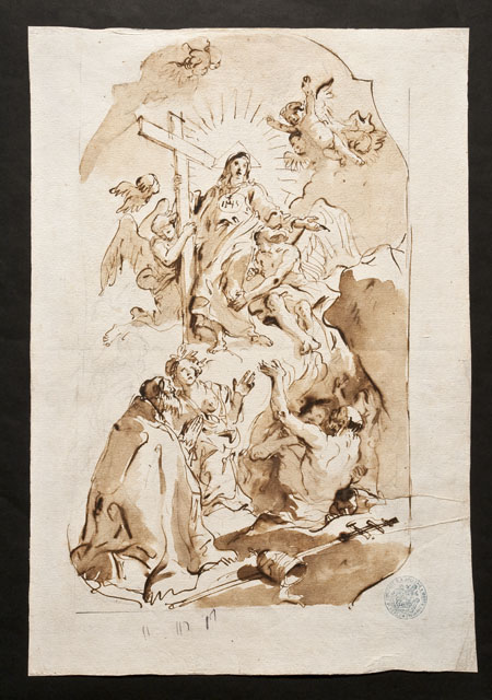Composizione circoscritta da una cornice mistilinea. Al centro in alto, Cristo con la croce circondato da due angeli, un angioletto e teste di angioletti. Ai suoi piedi, una figura femminile orante a seno nudo (Sant’Agata), una figura maschile orante con accanto mitra e pastorale (San Clemente papa) e due mezze figure che escono da una cavità (le anime del Purgatorio).