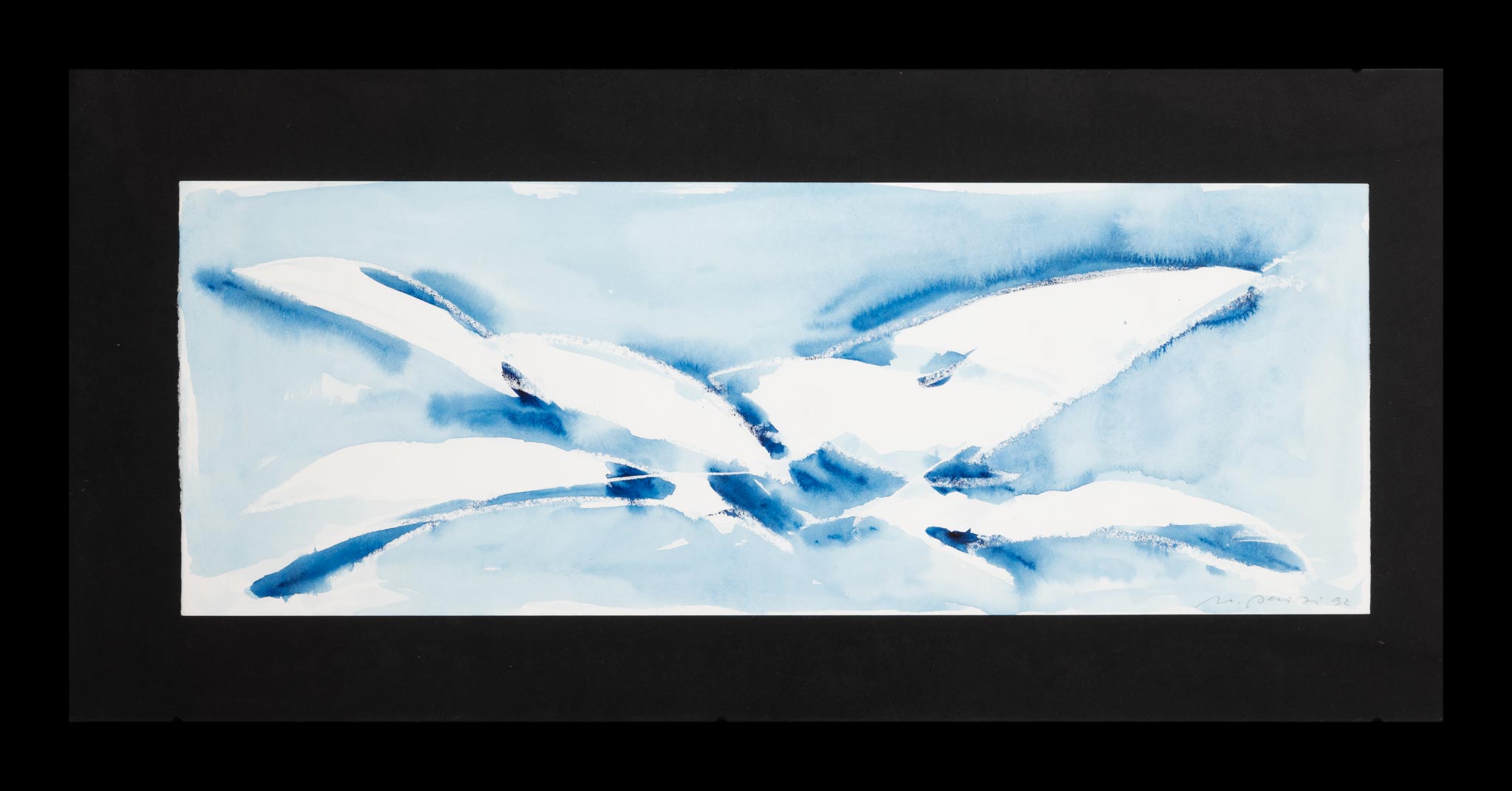 I colori protagonisti di questo dipinto ad acquerello sono il bianco e l'azzurro; a prima vista l'opera si presenta come una composizione astratta, una virtuosistica prova di macchie di colore acquerellate. Uno sguardo più attento permette di comprendere come a monte ci sia la volontà, da parte dell'artista, di sperimentare e interpretare il dato naturalistico (presente nel titolo "Nuvole e gabbiani") come riferimento puramente evocativo, in maniera personalissima, all'insegna di un intimo lirismo. È l'autore stesso a spiegare chiaramente l'intento della sua ricerca artistica della tarda maturità quando afferma che in: "queste nuvole cartacee, acquose […] si riflette il mio essere, il mio sentire. Con la tecnica dell’acquerello, il riscontro è immediato e riesco a catturare questi momenti che possono esaurirsi rapidamente; qualche tema l’ho ripetuto anche dieci volte, ma ne resta una sola versione". L'acquerello, datato 1992, fa parte di un insieme di 25 opere affini pubblicate da Perizi in un volume nel 1993 e presentate da Luigi Lambertini. In esso il dato naturalistico della rappresentazione si scompone nella luce, i volumi si smaterializzano nello spazio in una composizione che non perde l'equilibrio razionale e misurato e anzi segna un ritmo che fonda nel lirismo la propria forza espressiva. Lambertini definisce tale visione artistica "essenzialità primaria [...] al punto da essere diaframma di luce. [...] Il senso del volo, quella sospensione certa e leggera, erano il dettato di un processo progettuale che non rinnegava mai l’altra caratteristica del lavoro di Perizi e cioè quell’intimo lirismo che aveva, per l’appunto, nel rapporto forma-luce-spazio, la sintesi più alta. Il cielo ed il suo azzurro si stemperano nell’acqua del colore e la luce nel candore rugoso della carta." In proposito scriveva, nel 1991, anche Sergio Molesi: "[...] l'ultima impresa artistica è ancora più esaltante: dalla terra dove vivono e muoiono le foglie, l'artista, memore delle sue sculture esternatrici del volo, è partito alla conquista dell'azzurro dei cieli. Qui ha trovato le nubi, le bianche nuvole imbevute di chiarità che certamente gli hanno ricordato il prorompente luminismo che tanti anni prima egli aveva disciplinato nel gesto ordinatore. [...] il suo gesto nel contempo disgregatore e costruttore dà un senso di ordinata vitalità al rapporto tra il bianco e l'azzurro".