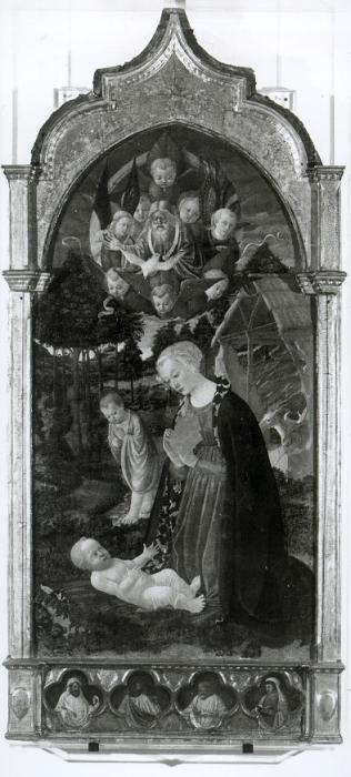 Maestro della Natività di Castello, Madonna in adorazione di Gesù Bambino con Isaia, Dio Padre tra angeli e colomba dello Spirito Santo - Quattro evangelisti [tempera su tavola], (1460 ca), 213 x 98 - Galleria dell'Accademia - Firenze - Toscana - Italia