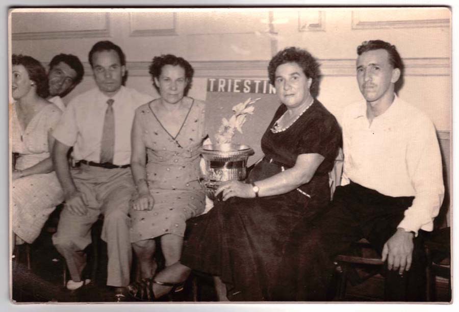 Ritratto di gruppo scattato a Buenos Aries nel 1956 nella festa per il campionato vinto con la squadra " Triestina". Si ricnoscono in primo posto dalla destra di chi osserva, Leonardo Racchetta ( emigrato nel 1950) con sua mamma, Maria Nevia Postich con vestito scuro.