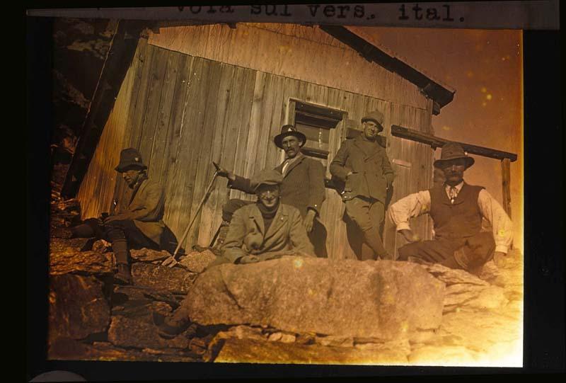Fuori alla capanna Luigi Amedeo di Savoia stanno in posa guide alpine e l' Avv. Carlo Chersi, presidente della Società Alpina delle Giulie dal 1921al 1959 in compagnia di 2 soci e amici. Il presidente è sorridente con gli occhiali al centro dell'imamgine