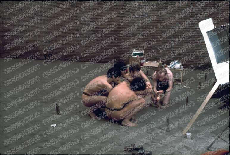 Cortile della Villa: brutalmente immobilizzata a terra dai Fottitori, unaRagazza piange disperata mentre il Presidente (Aldo Valletti), chinato verso di lei, un batuffolo di ovatta nella mano sinistra, si prepara a torturarla con la fiamma di una candela. La relativa distanza da cui è ripresa la scena consente di vedere i materiali e l'attrezzatura utilizzati sul set.