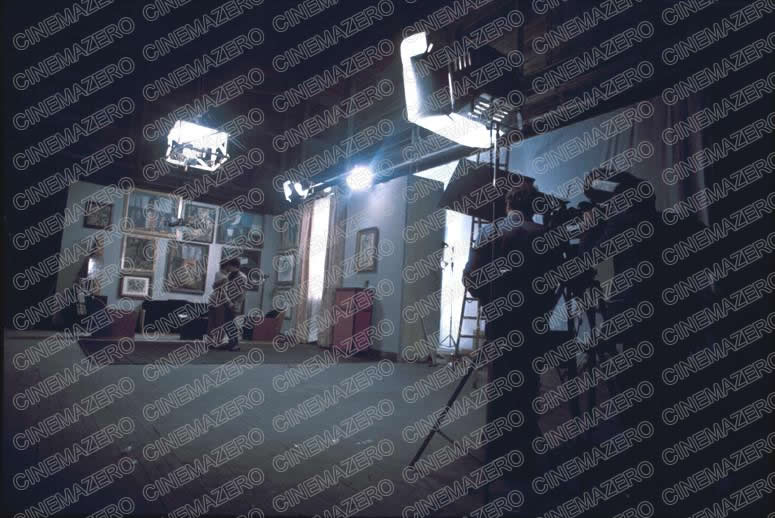 Teatro di posa: in ombra sulla destra, vicino ad un riflettore acceso, sivede il regista Pier Paolo Pasolini che, affiancato da un suo collaboratore, è intento a riprendere la scena finale del ballo dei due Collaborazionisti nella Sala dei Regolamenti.