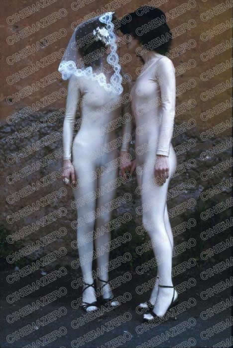 Le attrici Jill e Viviane Lucas ritratte in calzamaglia bianca mentre, l'una con un velo da sposa, l'altra con una bombetta indosso, simulano una coppia d'innamorati.