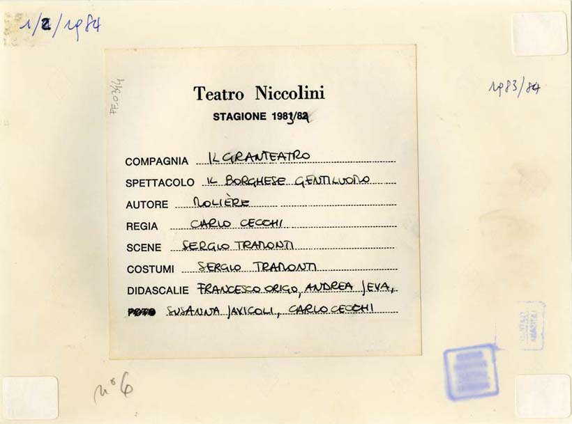 sul verso, sull'etichetta al centro: Teatro Niccolini/ Stagione 1983/84/ COMPAGNIA IL GRANTEATRO/ SPETTACOLO IL BORGHESE GENTILUOMO/ AUTORE MOLIERE/ REGIA CARLO CECCHI/ SCENE SERGIO TRAMONTI/ COSTUMI SERGIO TRAMONTI/ FRANCESCO ORIGO/ ANDREA JEVA,/ SUSANNA JAVICOLI, CARLO CECCHI