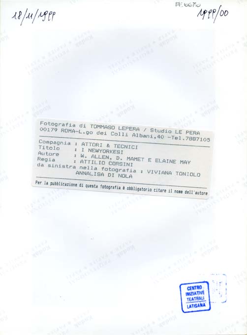 sul verso, al centro: ATTORI & TECNICI/ I NEWYORKESI/ W. ALLEN, D. MAMET E ELAINE MAY/ ATTILIO CORSINI/ VIVIANA TONIOLO/ ANNALISA DI NOLA