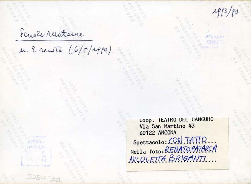 sul verso, sull'etichetta in basso a destra: Coop. TEATRO DEL CANGURO/ Via San Martino, 43/ 60122 ANCONA/ Spettacolo CON TATTO/ Nella foto RENATO PATARCA/ NICOLETTA BRIGANTI