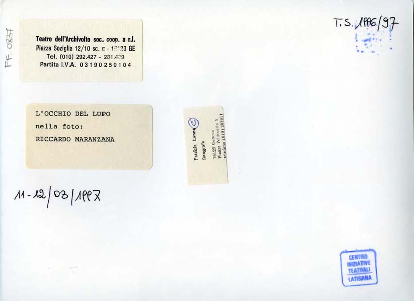 sul verso, sull'etichetta: L'OCCHIO DEL LUPO/ nella foto:/ RICCARDO MARANZANA