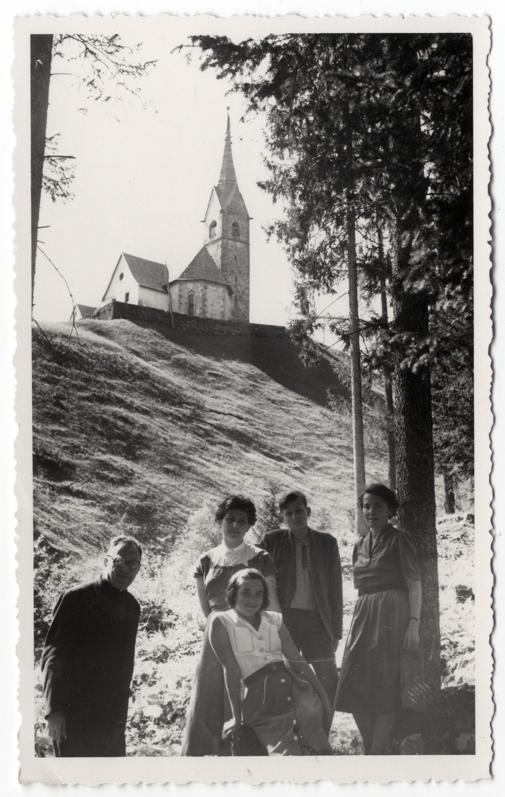 Veduta della chiesa di San Lorenzo Sauris di Sopra dal basso. In primo piano sono ritratti il parroco (a sinistra), una ragazza, due donne e un ragazzo.