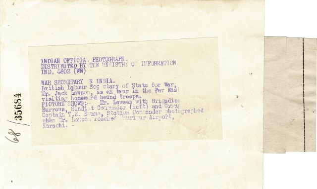 sul supporto primario, verso: INDIAN OFFICIAL, PHOTOGRAPH./ DISTRIBUTED BY THE MINISTRY OF INFORMATION/ IND. 4802 (WN)/ WAR SECRETARY IN INDIA./ British Labour Secretary of State for War, Mr. Jack Lawson, is on tour in the Far East/ visiting homeward bound troops./ PICTURE SCHOWS: Mr. Lawson with Brigadier/ Burrows, Sindist Commander (left) and Group/ Captain T.E. Evans, Station Commander photographed/ when Mr. Lawson reached Mauripur Airport,/ Karachi.