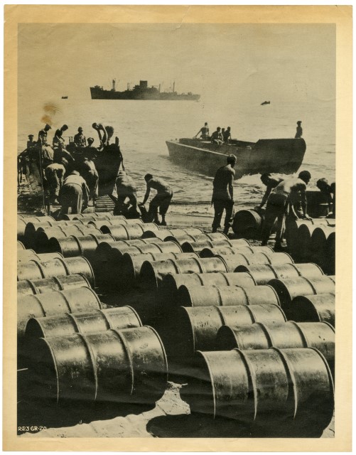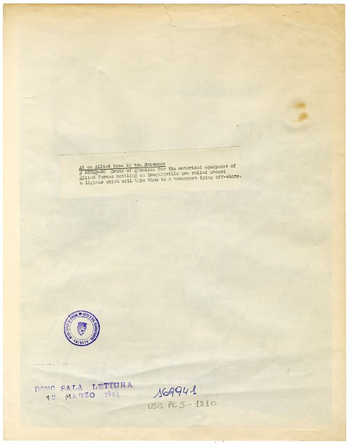 F32637 : Sul verso del supporto primario, timbro blu : 4789C\pSul verso del supporto primario, a grafite : 11\pSul recto del supporto primario, cartiglio : FUSTI DI BENZINA A PERDITA D'OCCHIO IN UNA BASE DEL/ PACIFICO.\p\pF169941 : Sul verso del supporto primario : At an Allied base in the Solomons/ # 223GR-20 Drums of gasoline for the motorized equipment of/ Allied forces battling on Bougainville are rolled aboard/ a lighter which will take them to a transport lying off-shore.