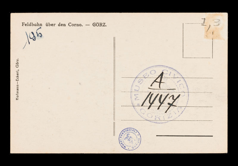 verso, in alto a sinistra: Feldbahn über den Corno - Görz/ La decauville sul Corno