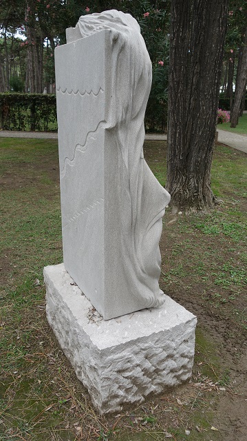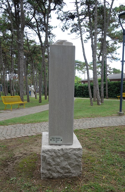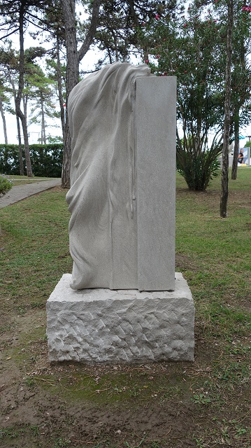 Nata a Udine e formatasi alla Scuola d’Arte con maestri come Dino Basaldella e Sergio Mazzola, Elena Faleschini ha attraversato un percorso che dalla scultura l’ha portata all’oreficeria negli anni Settanta, per poi ritornare, dal 1990, alla materia monumentale con una ricerca che unisce rigore e sensibilità organica. Le sue opere, diffuse in collezioni pubbliche e private in Italia e all’estero, testimoniano una costante tensione a trasformare la pietra in racconto plastico. In" Segni d’acqua" la scultrice affida alla pietra d’Aurisina il compito di farsi flusso e memoria liquida. La colonna verticale, apparentemente severa, è percorsa da incisioni ondulate e da rilievi che sembrano catturare il movimento dell’acqua: solchi che scendono come rivoli, superfici levigate che rimandano alla calma distesa di uno specchio, pieghe che ricordano increspature generate da un moto continuo. Anche la sommità del blocco non è mai ferma: si piega, si apre, suggerendo il perpetuo mutamento della corrente. Il titolo guida la lettura: l’acqua non è rappresentata in modo naturalistico, ma evocata attraverso il linguaggio della forma. È l’elemento vitale che plasma la materia, che lascia tracce nella pietra come la pioggia sulla roccia o il mare sulla scogliera carsica da cui la stessa Aurisina proviene. Così la scultura diventa al tempo stesso testimonianza e trasfigurazione, un segno che conserva nella durezza del calcare la leggerezza del fluire. In questo intreccio di solidità e movimento si riconosce l’identità artistica di Faleschini: capace di piegare la materia a un respiro più ampio, di trasformare la pietra in superficie d’acqua, di rendere palpabile nella forma l’eco di un elemento inafferrabile.