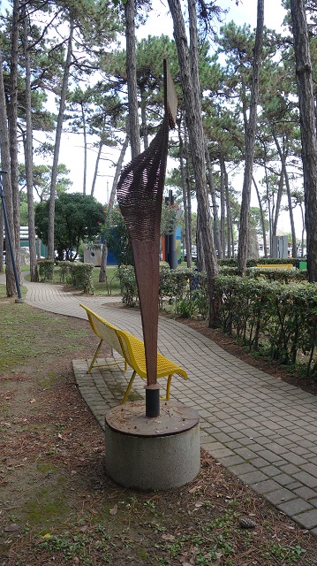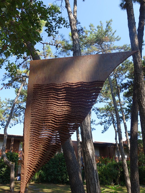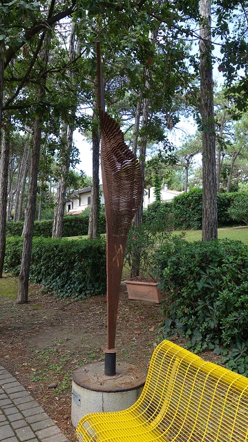 Nella Storia dell’uomo emerge la coralità della vita, l’eco del pensiero si stende con la volontà di dare, fare, sbagliare e rifare: è una continua sfida per capire e far vivere le varie entità ed i grandi valori della vita. La forma triangolare si erge verticalmente nello spazio partendo dal vertice; la superficie tagliata a segmenti si apre a ventaglio come energia della Volontà», così Simon Benetton definisce la sua opera realizzata a Lignano nell’estate del 2000, quando, dal 15 al 25 giugno trasformò una piastra di ferro davanti ai turisti in un laboratorio open air sotto i pini del Parco del Mare. Il 24 giugno venne organizzata una festa in collaborazione con il Comune di Lignano Sabbiadoro a coronamento dell’evento. Questa iniziativa si collocò a latere di una mostra dell’artista trevigiano che si tenne nella città balneare da giugno a settembre, con 13 sculture posizionate tra Lignano Pineta e il parco Hemingway a Sabbiadoro. Di queste opere rimase a Lignano “Arco balenante” attualmente collocata al Parco del Mare. La scultura “Volontà” si inserisce in una fase artistica di Benetton iniziata nei primi anni Ottanta nella quale l’artista prende come spunto forme geometriche semplici ricavate in lastre di metallo tagliate con la fiamma ossidrica in lamelle modulari, poi ritorte in audaci volute che sembrano sfidare la statica.