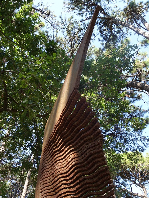 Scultura di forma triangolare, con una punta rivolta verso l’alto e leggermente piegata in avanti, che crea tensione verticale. La parte centrale è costituita da una sequenza di lamelle modulari che generano giochi di luce e ombra e danno leggerezza alla massa compatta del metallo.