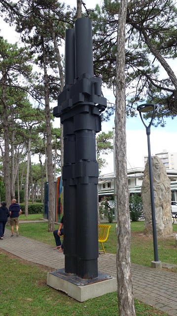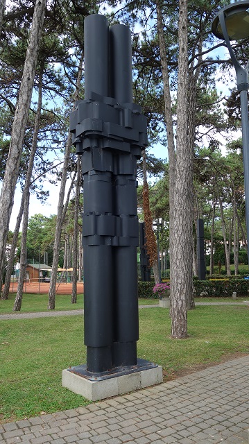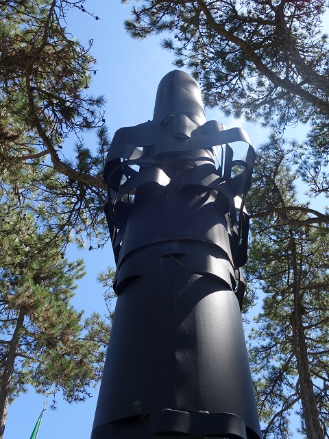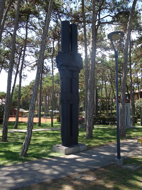 Ceschia installò numerose opere simili in spazi pubblici, spesso in contesti naturali o urbani, instaurando un dialogo con l’ambiente circostante. L’inserimento tra i pini, come nel caso qui documentato, rafforza la dimensione organica della scultura, che si staglia come una “pianta meccanica”, o come una colonna totemica dal sapore arcaico e moderno al tempo stesso: esempio riuscito di sintesi tra materia industriale e vocazione poetica. Ceschia non si limita a comporre una struttura verticale: plasma il ferro come fosse argilla, lo assembla con rigore quasi architettonico, ma lascia emergere una forza espressiva che travalica il puro design. Il nero opaco della smaltatura conferisce un tono severo, monumentale, ma anche introspettivo, quasi sacrale.