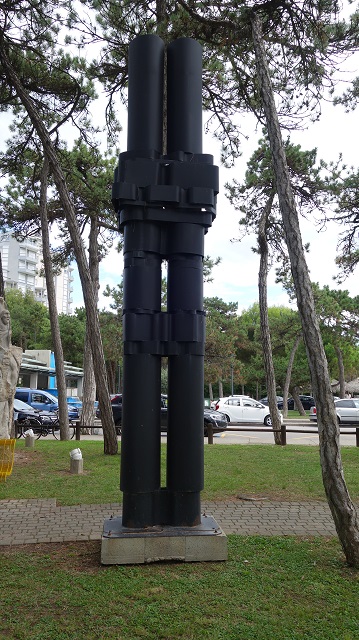 La scultura è costituita da due colonne tubolari nere con incastri geometrici a due fasce orizzontali che ne interrompono la verticalità. La simmetria e la scelta di una modulazione ritmica regolare e tuttavia interrotta da variazioni sulla piegatura delle lamine.