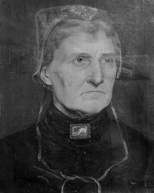Fondo marrone scuro. Volto molto espressivo dalle labbra sottili, il naso ricurvo, la carnagione rosata, più accesa sul mentoe sulle guance. Il vestito è nero, la cuffietta ha ricami dorati.