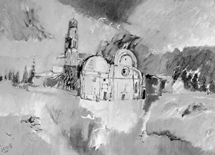 Roberto Joos, pittore di natali goriziani, studiò a Venezia dove poi si trasferì dal 1960. Oltre a dedicarsi alla pittura, è stato critico d’arte, scenografo e illustratore. I suoi esordi espositivi sono cominciati nel 1942 vincendo un premio ad una mostra giovanile e l’anno seguente espose insieme a Crali e Zigaina. Nel corso degli anni ha esposto in varie collettive in Italia e Austria e in personali in Svizzera, Austria, Venezia, Pavia, Firenze, Gorizia. Nel 1983 il Comune di Gorizia con il patrocinio della Regione Friuli Venezia Giulia gli dedicò un’importante antologica, poi trasferita a Mestre. Nel 1986 partecipò all’Expo di New York sul tema “Venice for you” e all’”International Contemporary Art Fair” di Londra. Altre partecipazioni all’estero sono state a Vienna, Parigi, Amsterdam, Bruxelles, Barcellona, Götrborg, Città del Messico, Zagabria. Nell’aprile del 1975 il Centro Culturale "Stella Matutina" di Gorizia gli ha organizzato una personale dove quest’opera dei Musei Provinciali è stata acquistata. Si tratta di una visione dell’isola lagunare di San Michele, uno dei tanti soggetti veneziani intrapresi da Joos durante gli anni ’70. Dal contatto con l’ambiente culturale veneziano così riporta “Iniziativa Isontina “ in occasione della mostra goriziana del 1975: “Ne è scaturita una pittura singolare, che non si apparenta a quella dei “lagunari”, ma rompe in un’impetuosa espressione cromatica, riscoprendo certi sotterranei umori dell’uomo che, dietro un’apparente serenità, rivela la concitazione, le paure, i traumi psicologici imposti dal nostro tempo. Gli esterni veneziani di Joos, senza dissimulare le origini espressioniste, si collocano nel piano di un racconto tutto intriso di emozioni e sentimenti, materiali dati senza pentimenti da un pennello che scorre sulla tela saturo di colori dove è possibile riconoscere i dati oggettivi, ma si capisce che essi sono sottomessi alle ragioni di una pittura che vuole essere testimonianza di vita.” (Fulvio Monai 2002, pp. 90 – 91)