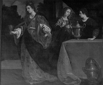 Nella prima redazione della scheda di catalogo l'opera è stata attribuita a scuola bolognese del XVII secolo dalla Malni, che sottolineava la difficoltà di interpretare il soggetto raffigurato. Nel 2010 Vittorio Sgarbi, in una comunicazione orale al personale dei Musei Provinciali, ha suggerito il nome di Giovanni Bilivert (Firenze 1585-1644), mentre in occasione di una prima presentazione del restauro cui la tela è stata sottoposta presso il laboratorio della Soprintendenza Archeologia, Belle Arti e Paesaggio di Udine, oltre a ribadire l'assegnazione ad ambito fiorentino del dipinto, è stata anche chiarita la sua iconografia. Spetta ad Alessandro Quinzi l'individuazione della dipendenza dal dipinto tradotto in incisione su disegno di Jean Baptiste Joseph Wicar e pubblicato nel secondo volume dell'opera "Tableaux, statues, bas-reliefs, et camées de la Galérie de Florence et du Palais Pitti, dessinés par Wicar, peintre et gravés sous la direction de C. L. Masquelier; avec les explications par Mongez, membre de l'Institut de France", edita in 4 volumi a Parigi tra 1789-1814. Nel repertorio delle Stampe di Traduzione, consultabile on line e curato dalla Scuola Normale Superiore di Pisa - Laboratorio delle arti visive, l'iscrizione "Paint par Corado.", presente sulla stampa, è stata interpretata come un riferimento a Corrado Giaquinto (Molfetta 1703-Napoli 1765) indicato quale autore dell'opera riprodotta. Si tratta invece di un dipinto eseguito da Francesco Curradi tra 1623 e 1625 per la sala delle udienze della villa di Poggio Imperiale, ora nella villa della Petraia a Firenze. Ne sono state individuate due repliche nell'Uster Museum di Belfast (pubblicata da Cantelli, 1983) e nei depositi del Museo del Cenacolo di Andrea del Sarto a Firenze, già Monastero di San Michele in San Salvi (cfr. scheda MiBAC NCT 09 00037782). Rispetto al prototipo l'opera goriziana presenta una minore estensione sulla sinistra, dove si scorge una porzione ridotta del mausoleo, e l'aggiunta del particolare del vaso e del vassoio in primo piano sulla destra.