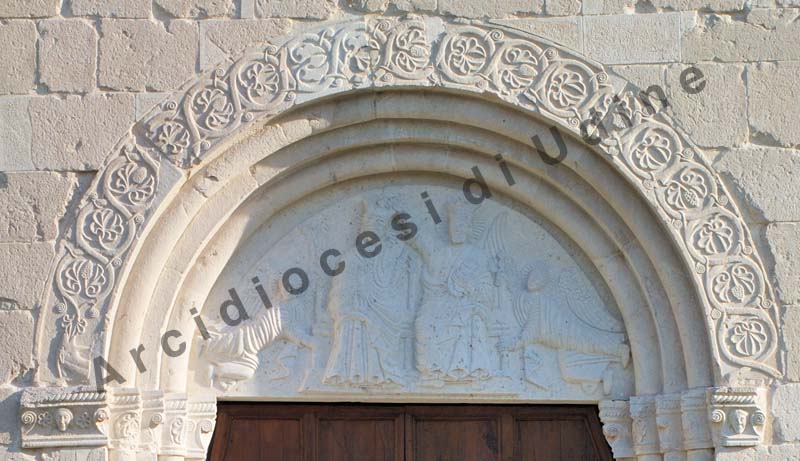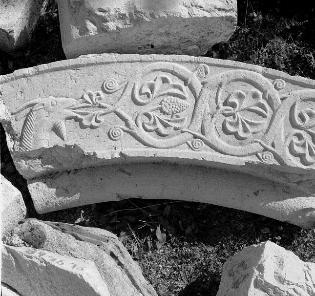Bassorilievo raffigurante un motivo vitineo con due ordini di tralci che si intrecciano formando una teoria di tondi decorati alternativamente da due foglie che si intrecciano e da due foglie staccate, a una delle quali è accostato un grappolo d'uva stilizzato. Il motivo si origina da una testa di capra. Si tratta del primo elemeto da sinistra dei quattro che compongono l'archivolto del portale.