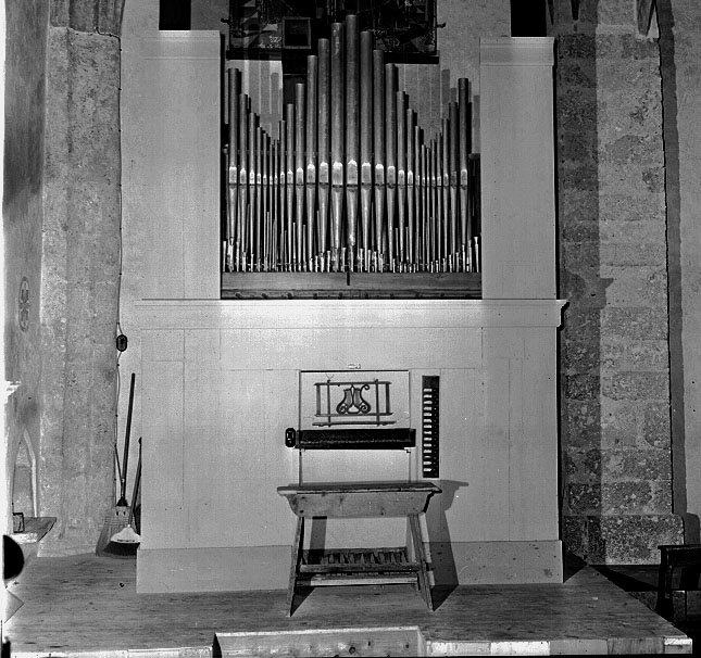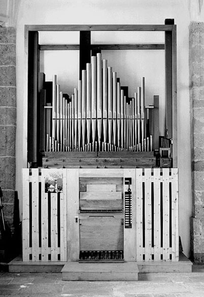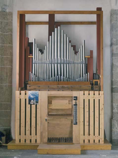 Organo settecentesco inserito in cassa armonica di tardo Novecento molto lineare.