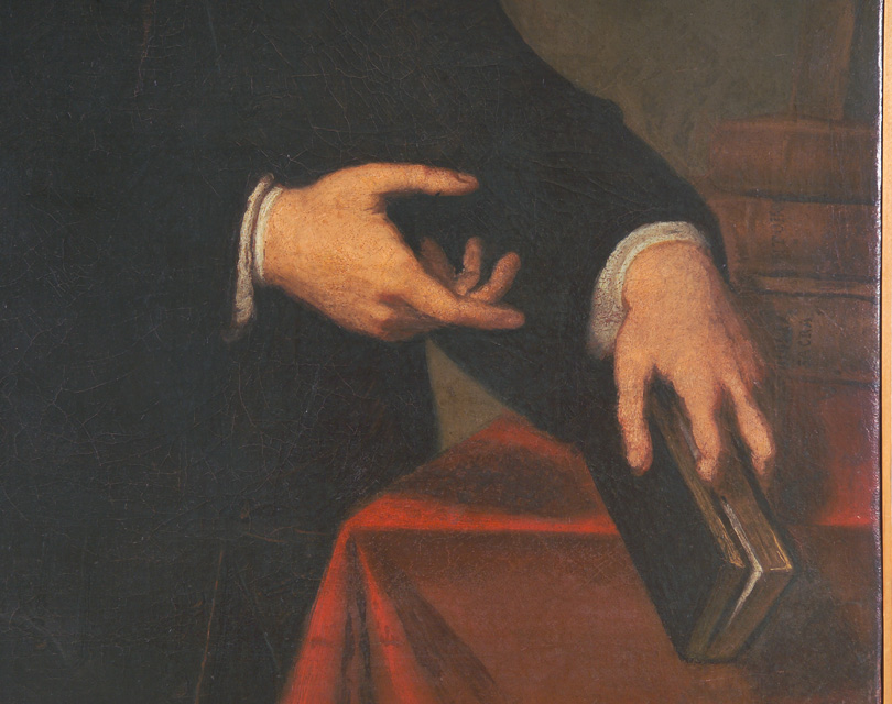 Il prelato è raffigurato a busto intero, rivolto di tre quarti verso destra, stante presso un tavolo coperto da un drappo rosso sul quale poggia una pila di libri. Egli rivolge lo sguardo all'osservatore indicando con la mano destra il libro che trattiene sul tavolo con la mano sinistra. L'uomo indossa una camicia bianca dalle ampie maniche arricciate ai polsi sotto una vesta nera chiusa al collo da un rigido colletto azzurro. L'abito è completato una marsina nera senza collo, con ampi paramani e alette sagomate.