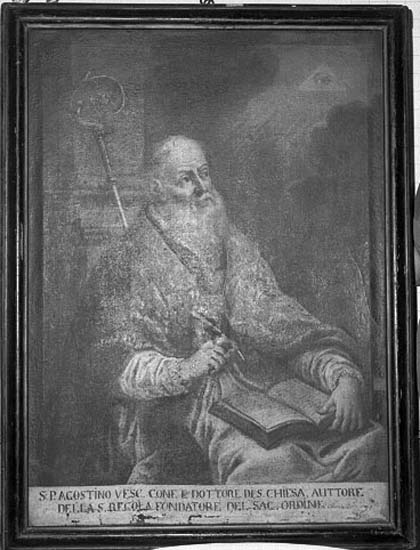 in basso: S: P. AGOSTINO VESC. CONF. E DOTTORE DI S. CHIESA, AUTTORE/ DELLA S. REGOLA FONDATORE DEL SAC. ORDINE.