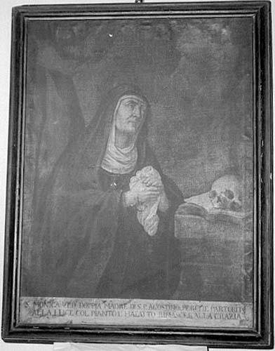 Santa Monica, madre di Sant'Agostino, indossa delle scure vesti matronali ed è ritratta in atteggiamento mistico, mentre volge lo sguardo verso il cielo. Alludono alla meditazione della Santa pure il libro aperto e il teschio, appoggiati sulla destra sopra un basamento.