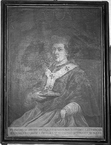 Francesco de Sourdis, protettore delle orsoline francesi, era soprannominato, per la sua fervida attività di promozione dei valori cattolici, il "San Carlo di Francia". L'arcivescovo francese trova posto nella galleria goriziana di Santi e personaggi legati all'Ordine di Sant'Orsola in quanto fondatore della sede conventuale di Bordeau, considerata la casa madre di quella isontina. Il volto, in vero dalle non eccellenti qualità espressive, segue alcuni consueti esemplari prediletti dal Lichtenreiter (Antonello, 1996, p. 108).