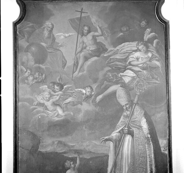 Il dipinto raffigura l'episodio in cui sant'Agostino, che camminava lungo la riva del mare meditando sulla Trinità, si imbatte in un bambino che, dopo aver scavato una buca nella sabbia, tenta invano riversarvi tutta l'acqua del mare servendosi di un mestolo. Un'operazione altrettanto impossibile di quella del santo di penetrare il mistero della Trinità. Quest'ultima, circondata da angeli, si scorge in alto, al centro di uno squarcio luminoso tra le nubi.