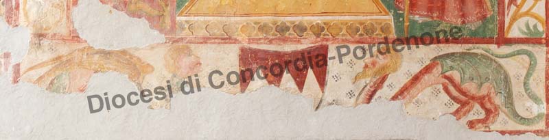 La fascia posta sotto l'affresco con la Madonna con Bambino in trono tra san Giovanni evangelista e san Giacomo il maggiore accoglie due creature fantastiche affrontate allo stemma centrale della famiglia Attimis (o Attems). Esse costituiscono un ibrido mostruoso dalla testa maschile barbata desinente da un lungo collo anguiforme e un corpo di drago caudato.