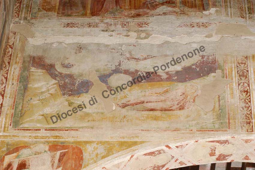 L'affresco raffigura l'episodio della visione di san Giovanni evangelista a Patmos, dove era stato esiliato dall'imperatore Domiziano. Vi si scorge infatti l'apostolo addormentato disteso a terra mentre nel cielo sopra di lui ha luogo lo scontro tra la donna e il dragone, del quale si scorge la sagoma e il profilo ansato del collo. Accanto al santo giace un grande volume nel quale verranno riportate le visioni apocalittiche.