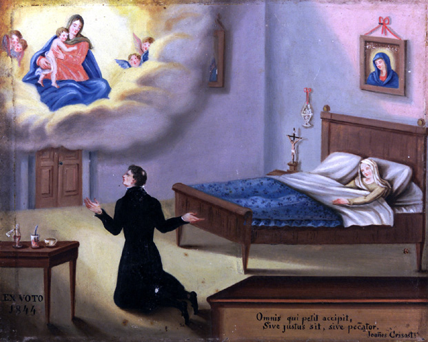 La scena si svolge all'interno di una stanza da letto:a destra è posto il letto dove è coricata la persona sofferente, sopra la testiera e sul comodino sono visibili l'effigie della Vergine e il crocifisso, oggetti che ma nifestano la religiosità della malata. Al centro della stanza è ritratto un familiare, in ginocchio, in atto di intercedere presso la Vergine che appare nella parte sinistra del dipinto con il Bambino in braccio, entro un nimbo di nubi.