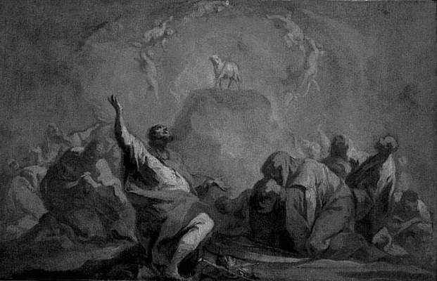 Nel suo studio Bruno Bushart (1984, p. 5) definisce il dipinto "opera certa di Fr. J. Spiegler", specificando inoltre che il bozzetto si riferisce all'affresco realizzato nel coro della chiesa di Merdingen (circondario di Friburgo in Brisgovia). Herman Brommer (1989 p. 14) individua un riscontro ancora più puntuale con l'affresco posto sopra l'altare maggiore della chiesa del castello di Mainau, sull'isola del Bodensee, presso Costanza. Spiegler fu chiamato ad operare prima a Mainau, quindi a Merdingen dall'architetto Johann Kaspar Bagnato, che sovrintese i lavori di costruzione di entrambe le chiese. Il motivo dell'Apparizione dell'Agnello, eseguito nella chiesa di Mainau, fu poi riposto nel 1739, con qualche variazione, nella parrocchiale di Merdingen.