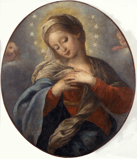 La Vergine, con lo sguardo rivolto verso il basso e il capo reclinato verso destra, tiene le mani sul petto. Il velo chiaro cinge le spalle e scende sulla veste rossa, il manto blu ricade dal braccio destro. Un'aureola di stelle circonda il viso aggraziato di Maria. Ai lati compaiono due cherubini.