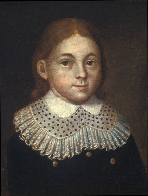 Il bambino, ritratto frontalmente a mezzo busto, indossa un abito scuro con tre bottoni metallici, un ampio colletto bianco inamidato con bordo di pizzo leggero arricciato.