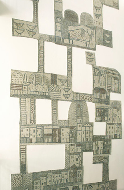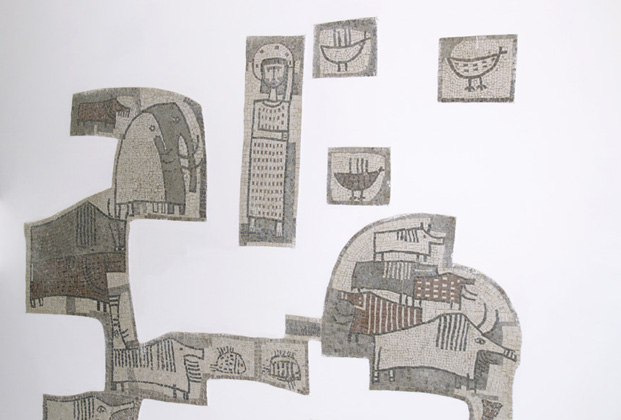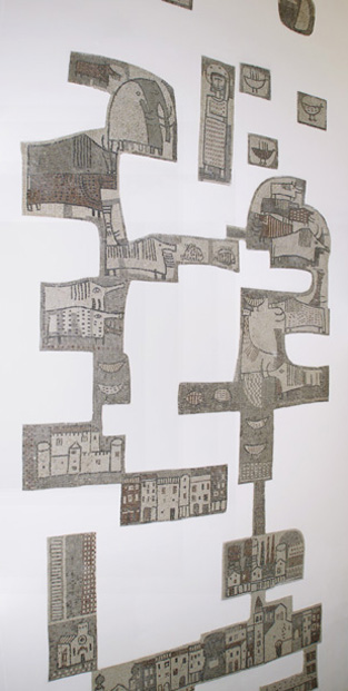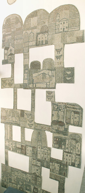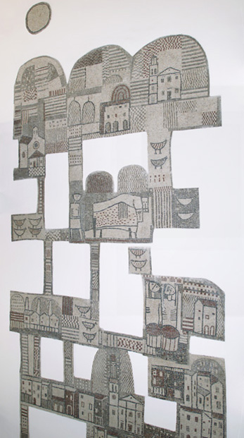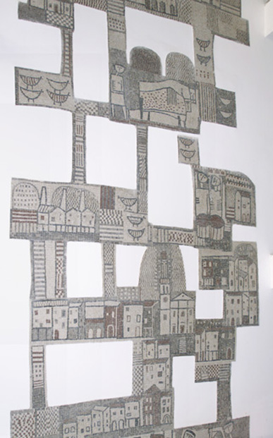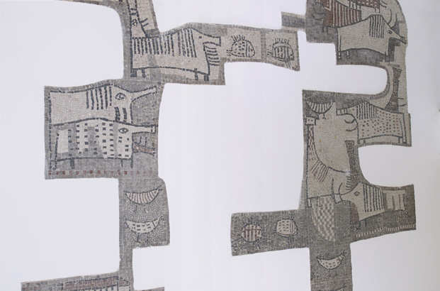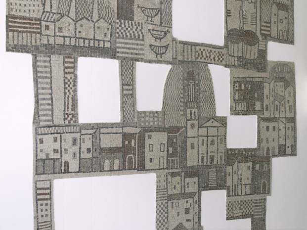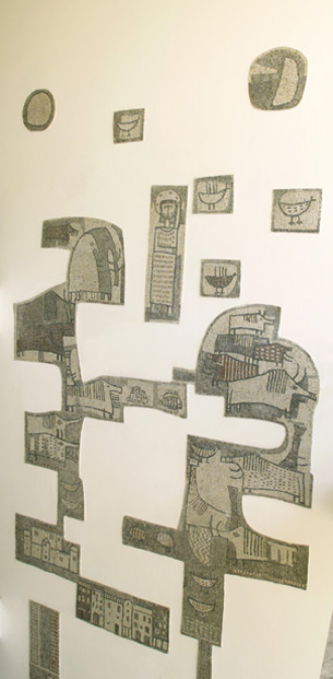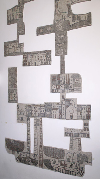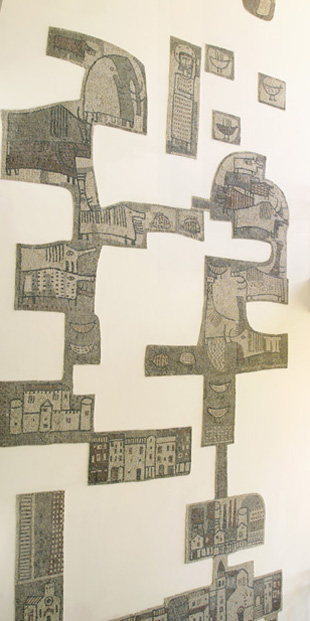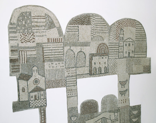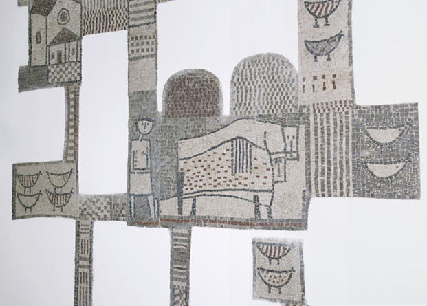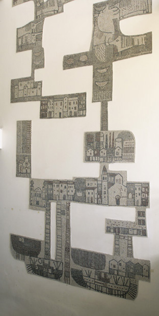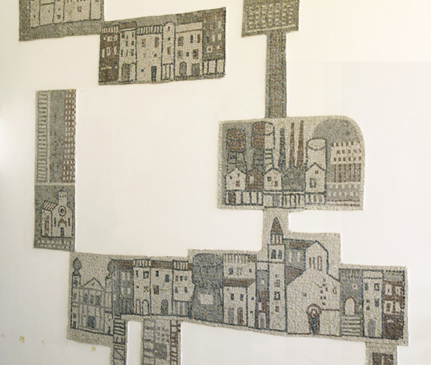 Il mosaico, che presenta un profilo irregolare e si dispone a pezzi sulla parete, rappresenta i monumenti più significativi di Cormons, il paesaggio, le case, gli animali.
