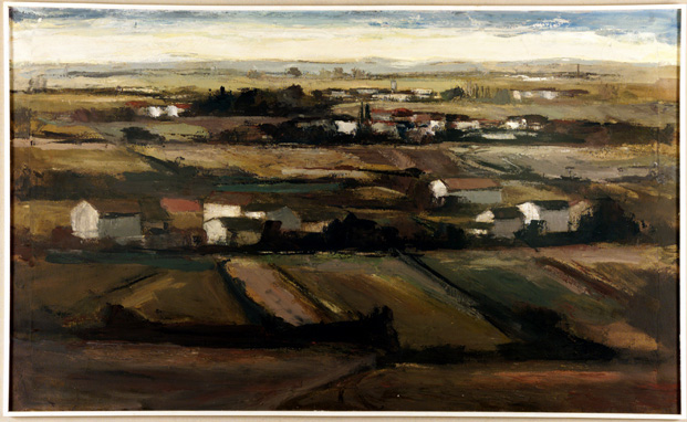 Paesaggio dall'orizzonte alto, dove si distinguono i campi coltivati e le case rurali. Dipinto con cornice e senza vetro.
