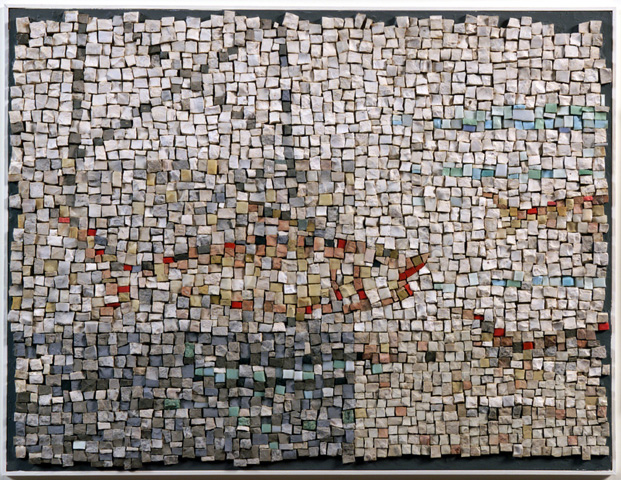 Si tratta della realizzazione a mosaico di un particolare del bozzetto eseguito per il concorso, indetto nel 1959 dalla C.C.I.A.A. per la realizzazione della decorazione musiva della sala riunioni.