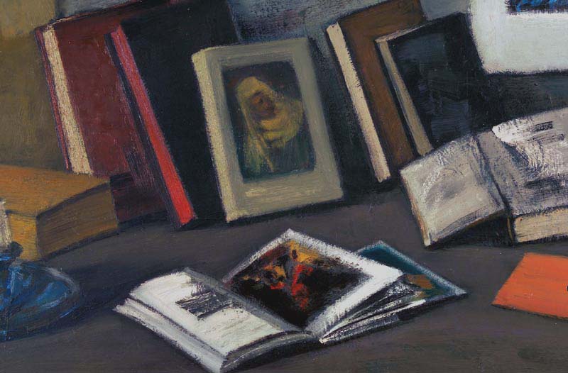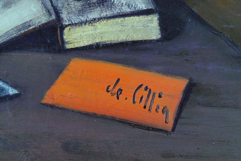 De Cillia sembra qui non staccarsi ancora dai maestri di riferimento, in particolare netti sono alcuni richiami all’espressionismo e ai vari linguaggi artistici di fine Ottocento. Non solo i colori del Van Gogh francese, ma anche citazioni più precise come le immagini appese alle pareti, richiamo ad una moda che inizia proprio a fine Ottocento di introdurre nel quadro il proprio ritratto attraverso una seconda immagine. La figura umana, esclusa questa indiretta rappresentazione, è assente, come in gran parte dei lavori di De Cillia, per lasciare posto a semplici oggetti parte della reale vita di ogni giorno: libri, candele, lanterne. Il genere permane quello della natura morta, ma grazie ai primi incontri con il paesaggio Carsico agli inizi degli anni Cinquanta, la tavolozza di De Cillia comincia a schiarirsi. Spiccano tra i marroni dai toni sabbiati, gli arancione e i rossi che diverranno una consuetudine nei suoi ultimi lavori.