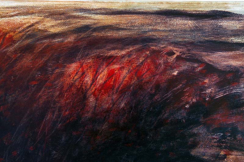 Il dipinto non presenta iscrizioni di data né sul fronte né sul retro, ma con ogni probabilità possiamo avanzare un ipotesi di datazione agli ultimi anni di operato dell’artista. È tipico degli anni Ottanta infatti l’uso del grande formato orizzontale e l’insistenza su un particolare del paesaggio. Qui De Cillia ingrandisce a dismisura il particolare dei rami di arbusti piegati dal vento. Il colore steso con dinamicità, si raggruma e si stempera in un ritmico alternarsi a ricreare il fenomeno naturale del vento. Come in un ricordo, non c’è nulla di distinto, ma un continuum di segni e colori, un vortice di pennellate colorate.