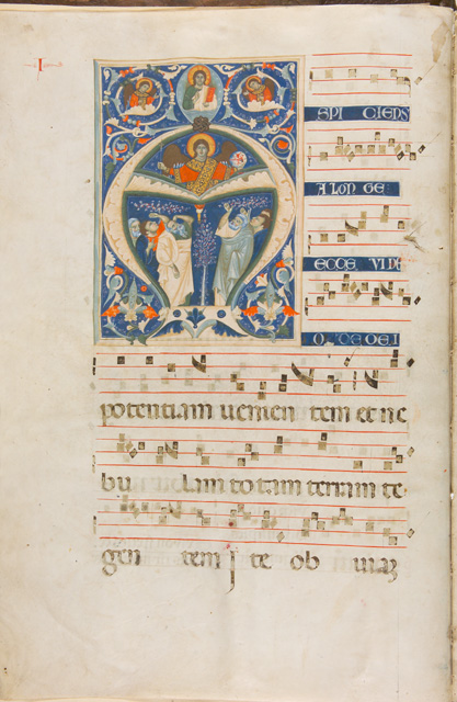 Iniziale istoriata A: Aspiciens [...]. Campo blu delimitato da una cornice rosa e azzurra. Corpo lettera rosa decorato con motivi a intreccio e volute vegetali variopinte. Spazio interno alla lettera diviso in due registri: in quello superiore appare l'arcangelo Gabriele (?) con lo scettro sormontato da un giglio e il globo; in quello inferiore sei apostoli rivolti verso l'alto, in due gruppi divisi da un alberello stilizzato. In alto, sopra la lettera, Cristo benedicente entro un clipeo con il libro in mano; ai lati, entro girali vegetali, due angeli.