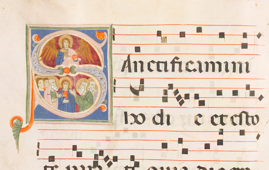 Iniziale istoriata S: Santificamini [...]. Campo blu delimitato da una cornice rosa e verde. Corpo lettera rosa decorato con tondini, motivi vegetali e piccole appendici fogliacee. Spazio interno alla lettera diviso in due registri; in quello superiore: un angelo con le ali spiegate, il globo nella mano sinistra; nel registro inferiore: la Madonna circondata dagli apostoli.