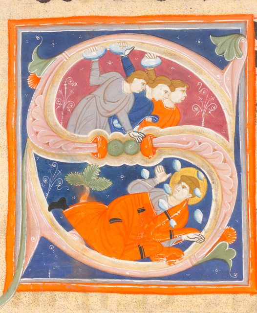 Iniziale istoriata S: Stephanus [...]. Campo blu delimitato da una cornice azzurra e arancione. Corpo letera rosa ornato con tondini e piccole appendici fogliacee. Interno lettera: nel registro superiore, tre uomini lanciano pietre; in quello inferiore, Santo Stefano lapidato a terra, vicino a lui una piccola palma.