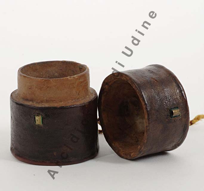 Custodia cilindrica in legno rivestito di cuoio e tessuto, con coperchio ad incastro; le due parti sono unite da un cordoncino fissato su ciascuna metà attraverso un anello metallico.